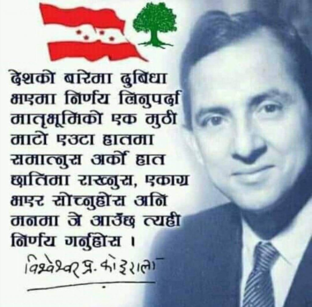 नेपाली राजनीतिका महान नायक, प्रजातान्त्रिक समाजवादका प्रबर्दक, नेपाली कांग्रेस पार्टीका संस्थापक, नेपाली साहित्य जगतका मूर्धन्य व्यक्तित्व, जननिर्वाचित प्रथम प्रधानमन्त्री जननायक स्व. वि. पि. कोइरालाको ४०औँ स्मृति दिवसको अवसरमा उहा प्रति भावपूर्ण श्रद्धासुमन