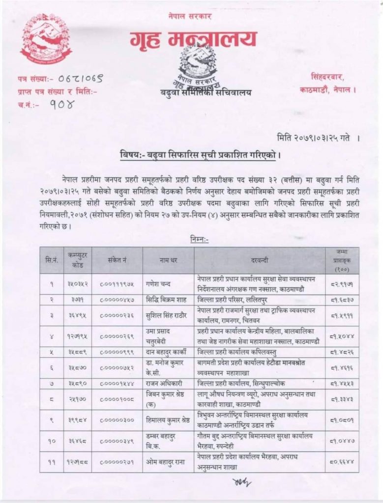 नेपाल प्रहरीका ३२ एसपी एसएसपी बढुवामा सिफारिस