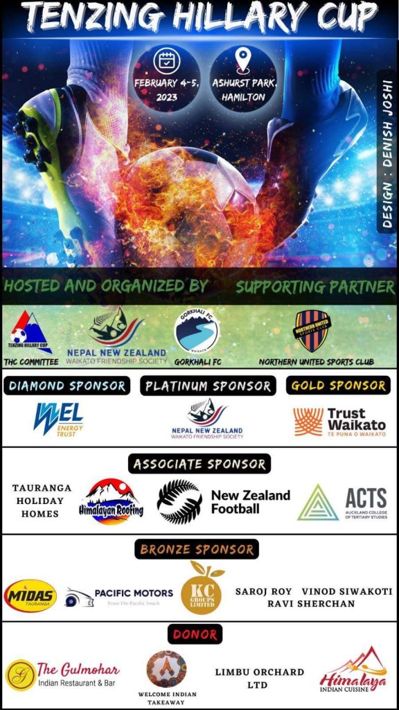 आउदो फेब्रुअरीको ४ र ५ तारिकका दिन हुन लागेको प्रतियोगिताको आयोजना टी.एच.सी. कमिटी, गोर्खाली फूटबल क्लब वाईकातो र नेपाल न्युजिल्याण्ड फ्रेन्डसिप सोसाईटि ह्यामिल्टन को सहकार्य मा गर्न लागेको हो भने सपोर्टीङ पाट्नर मा नर्थन युनाईटेड स्पोर्ट्स क्लब हो।