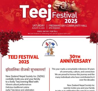 अकल्याण्ड – न्युजिल्याण्ड नेपल सोसाइटी इन्क (NZNS) ले आउँदो शनिबार, २३ अगस्ट २०२५ मा अकल्याण्डको फ्रीमेन्स बे कम्युनिटी हलमा “तीज महोत्सव २०२५” तथा संस्थाको ३०औँ वार्षिकोत्सवको भव्य समारोह आयोजना गर्न लागेको छ। अपराह्न ४ बजेदेखि सुरु हुने यो कार्यक्रम निःशुल्क प्रवेशसहित सबैका लागि खुला रहनेछ। यस वर्षको विशेष आकर्षण दुई चरणमा विभाजित गरिएको छ। पहिलो […]