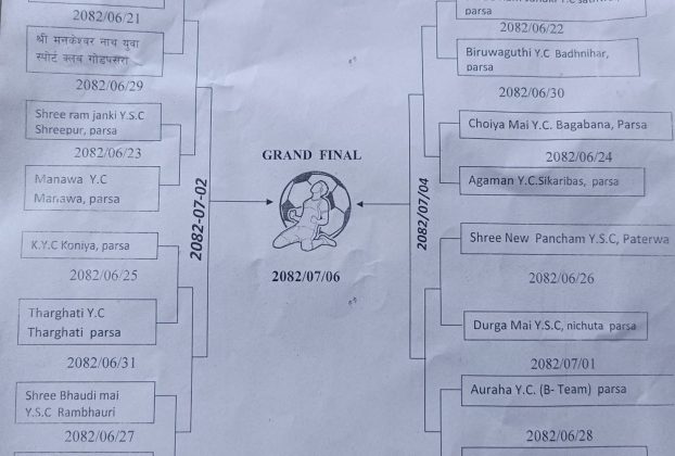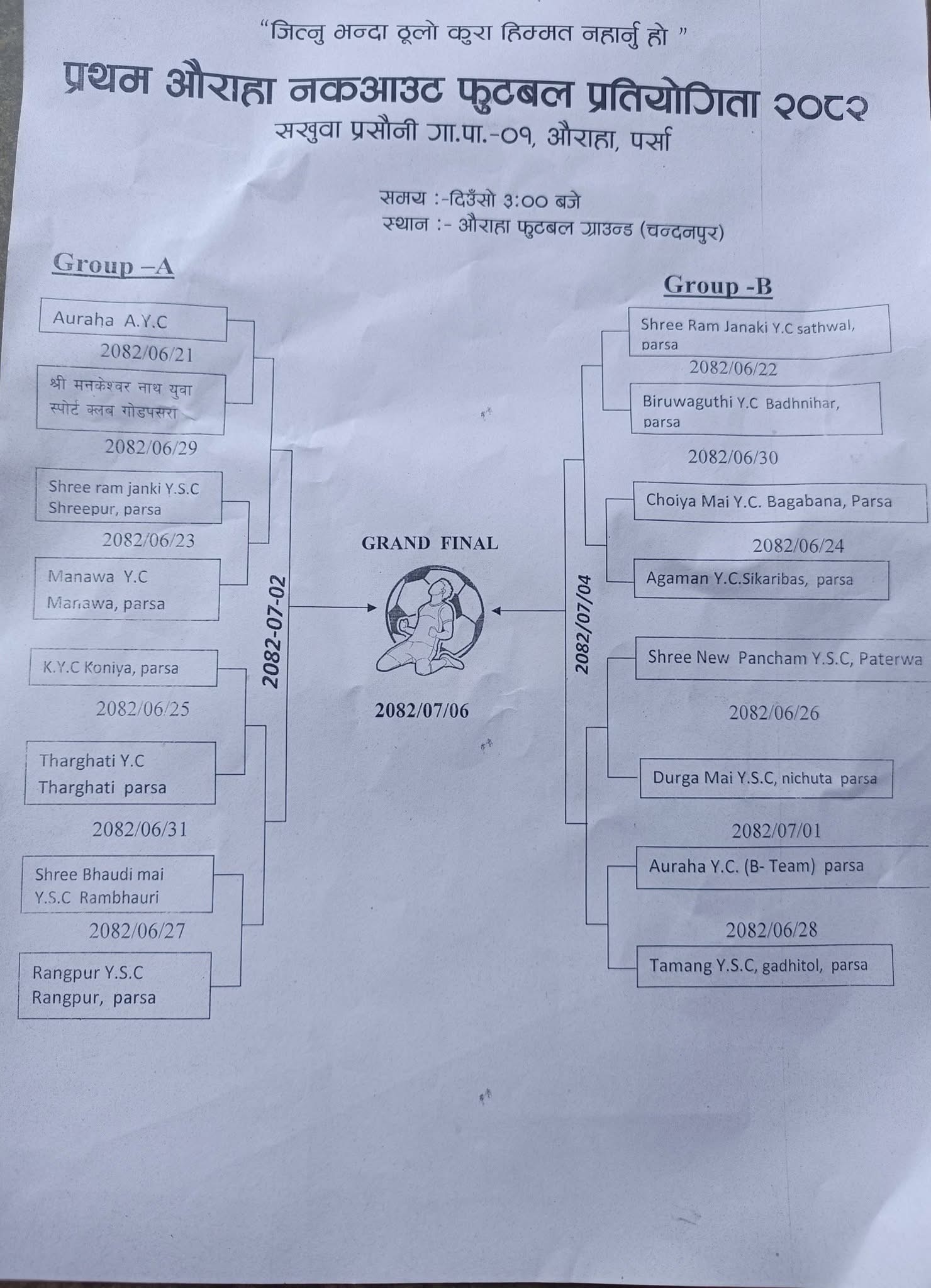 - प्रथम औराहा नकआउट फुटबल प्रतियोगिता २०८२ सुरु २०७९ असार ४, शनिबार १५:३१