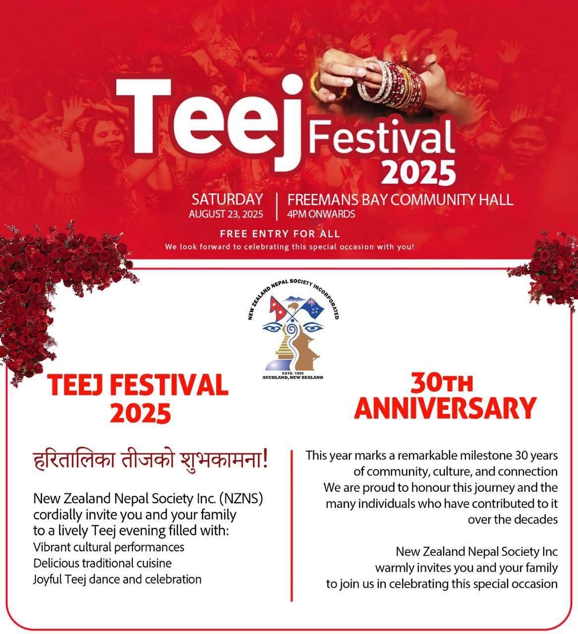 अकल्याण्ड – न्युजिल्याण्ड नेपल सोसाइटी इन्क (NZNS) ले आउँदो शनिबार, २३ अगस्ट २०२५ मा अकल्याण्डको फ्रीमेन्स बे कम्युनिटी हलमा “तीज महोत्सव २०२५” तथा संस्थाको ३०औँ वार्षिकोत्सवको भव्य समारोह आयोजना गर्न लागेको छ। अपराह्न ४ बजेदेखि सुरु हुने यो कार्यक्रम निःशुल्क प्रवेशसहित सबैका लागि खुला रहनेछ।