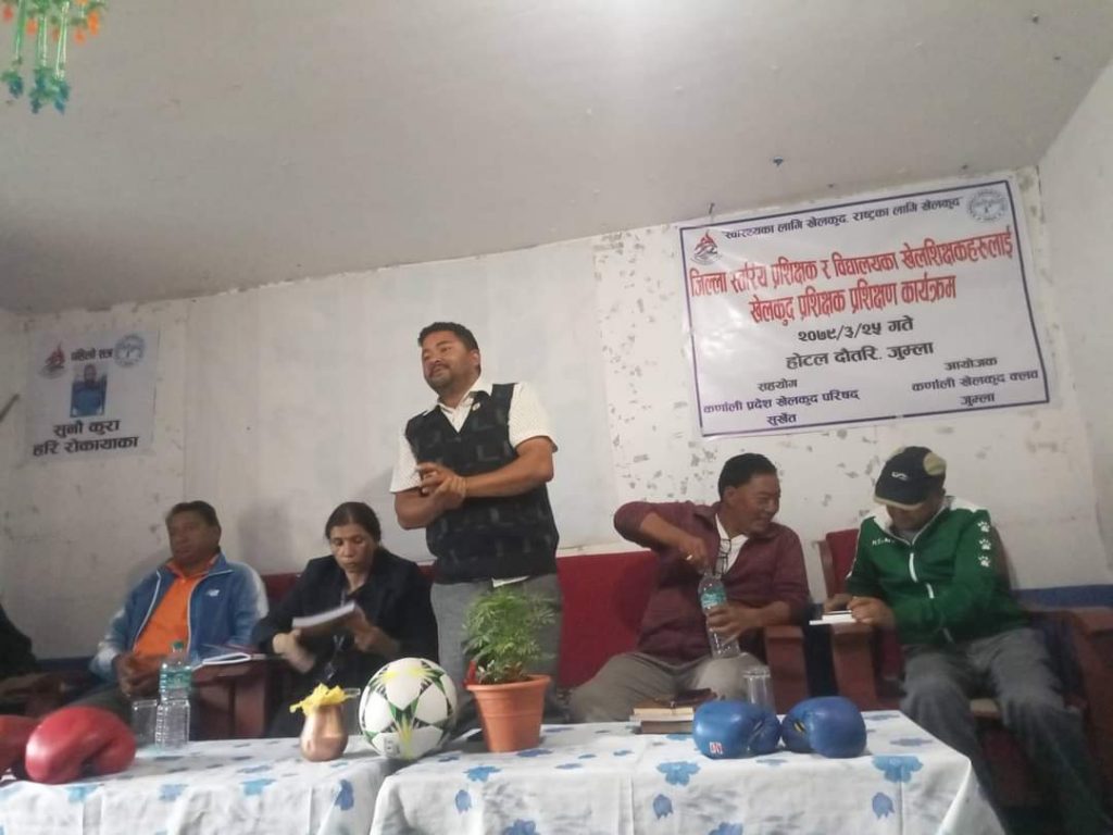 जुम्ला । जुम्लाको खेल क्षेत्रको विकास गर्नका लागी विद्यालय स्तरमा प्रशिक्षण कार्यक्रम गरिएको छ । कर्णाली खेलकुद परिषद् सुर्खेतको आर्थिक सहयोग र कर्णाली स्पोर्ट क्लबद्वारा आयोजित जुम्लाका सामुदायिक विद्यालयका खेल शिक्षकलाई प्रशिक्षक दिइएको छ । एक दिने जिल्ला स्तरीय प्रशिक्षक र विद्यालयका खेलशिक्षकलाई प्रशिक्षक तथा प्रशिक्षण कार्यक्रममा क्लबबाट १५ जना, विद्यालयबाट २४ जनासँगै, तेकान्दो, एन्फा र मार्सलाट तर्फका गरी जम्मा ८९ जना सहभागी भएको कर्णाली खेलकुद क्लबका सहसचिव धनराज सुनारले जानकारी दिए । त्यस्तै कर्णाली स्पोर्ट क्लबद्वारा आयोजित जुम्लाका सामुदायिक विद्यालयका खेल शिक्षकलाई प्रशिक्षक प्रशिक्षण कार्यक्रममा चन्दननाथ नगरपालिकाका मेयर राजु सिंह कठायतले खेलका नियमसँगै खेलाडीलाई अनुशासनका कुरा सिकाउन आवश्यक रहेको बताए । उनले भने जुम्लामा हुने हरेक खेलकुद आयोजनामा विभिन्न कारणले झगडा र विवाद हुने भएकोले अनुशासनको कमी देखिएको देखिन्छ । खेल क्षेत्रको विकासमा आवश्यक सहयोग गर्न नगरपालिका प्रतिबद्ध रहेको उल्लेख गरे ।