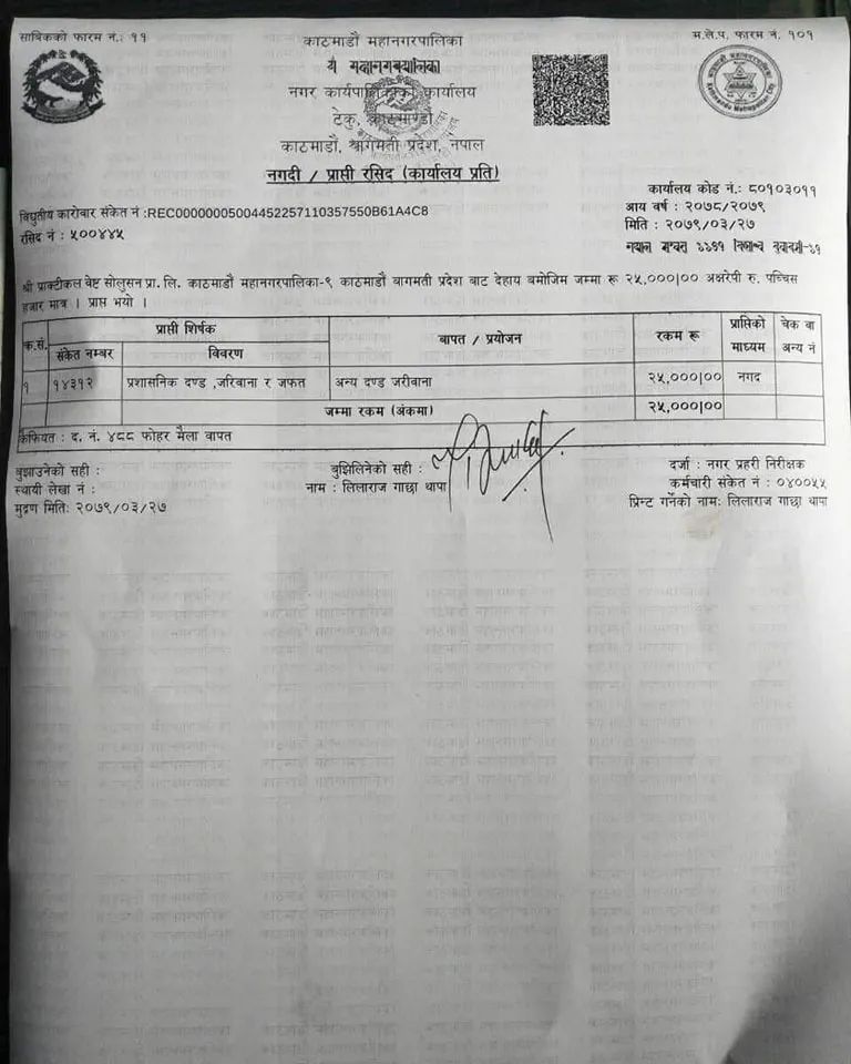 धोबीखोलामा फोहोर फाल्ने ‘प्राक्टिकल वेस्ट सोलुसन प्रालि’लाई काठमाडौं महानगरपालिकाले २५ हजार रुपैयाँ जरिवाना गरेको छ ।