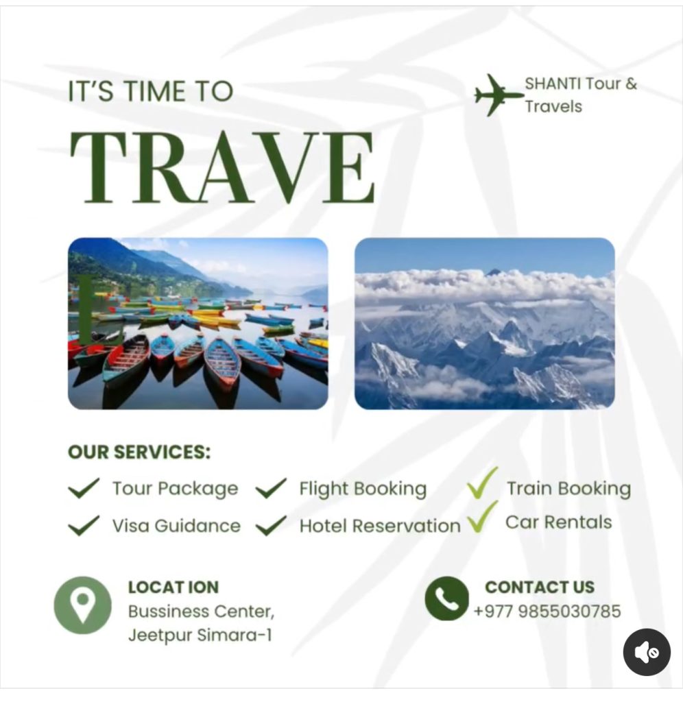 कम्पनीको नारानुसार – “Traveling isn’t costly if you are traveling with us.” – यात्रा अब महँगो रहने छैन, जब तपाईं शान्ति टुर एन्ड ट्राभल्ससँग यात्रा गर्नुहुन्छ।
